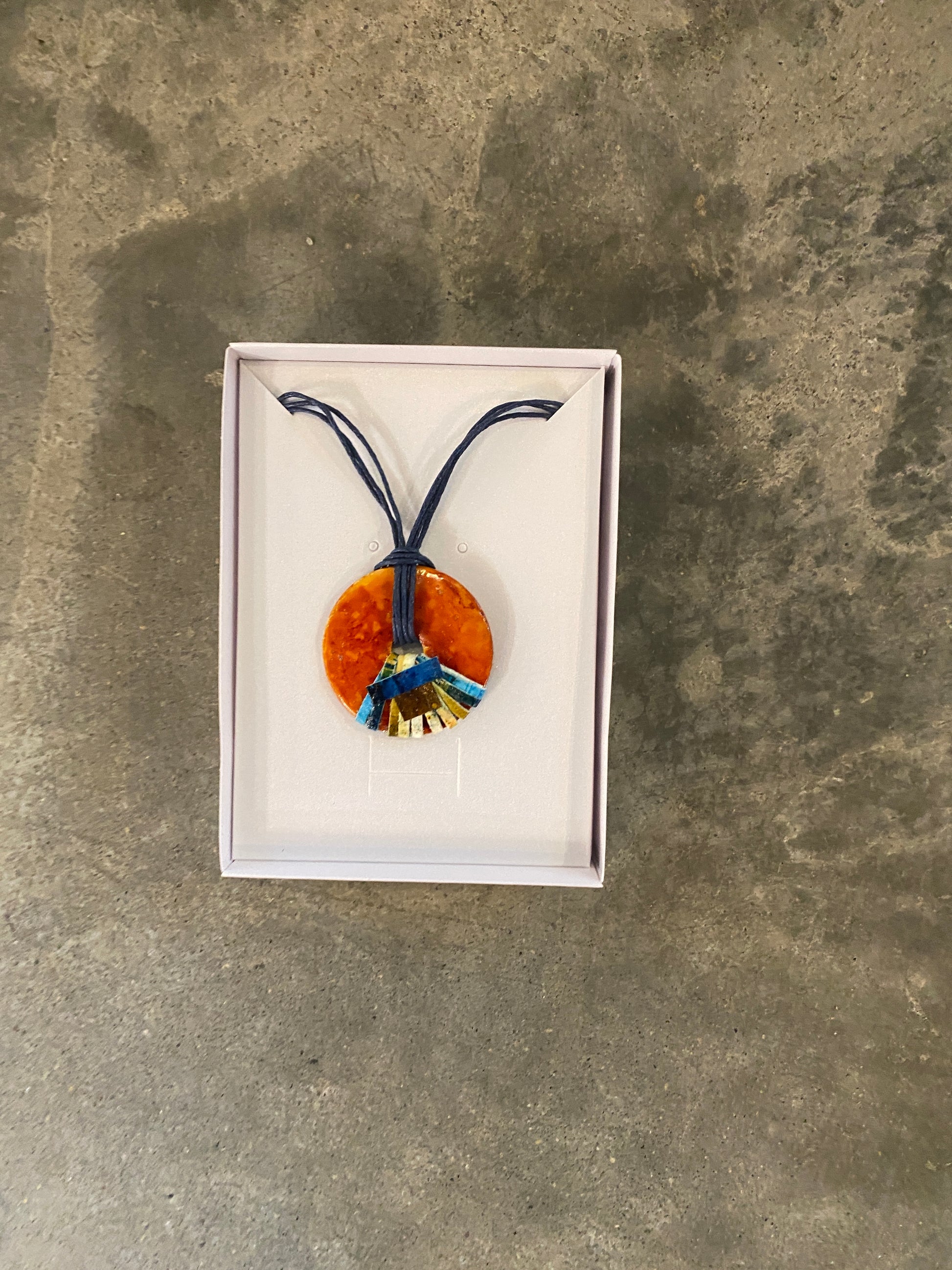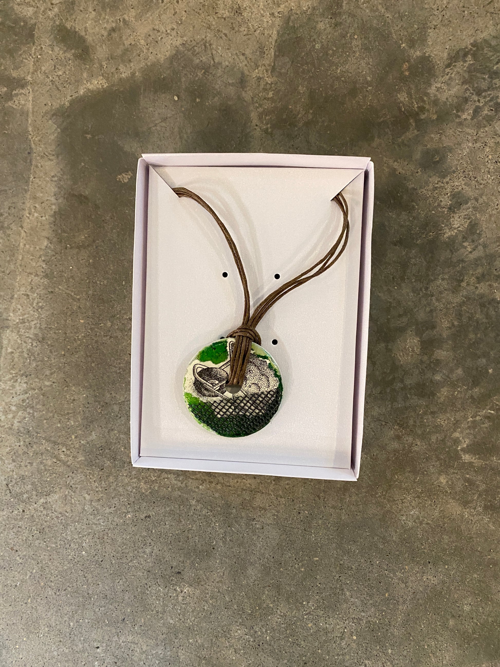 Pendant and earring set crafted from a metal washer, paper, alcohol Ink, epoxy resin, and put on a leather cord by Rozanne Wijesinghe.