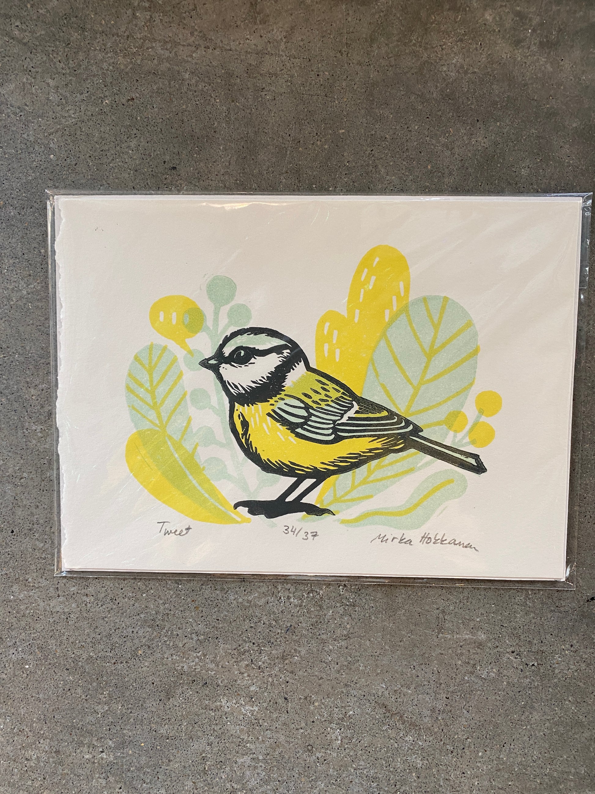 7 x 5 three-block linocut print by Mirka Hokkanen.